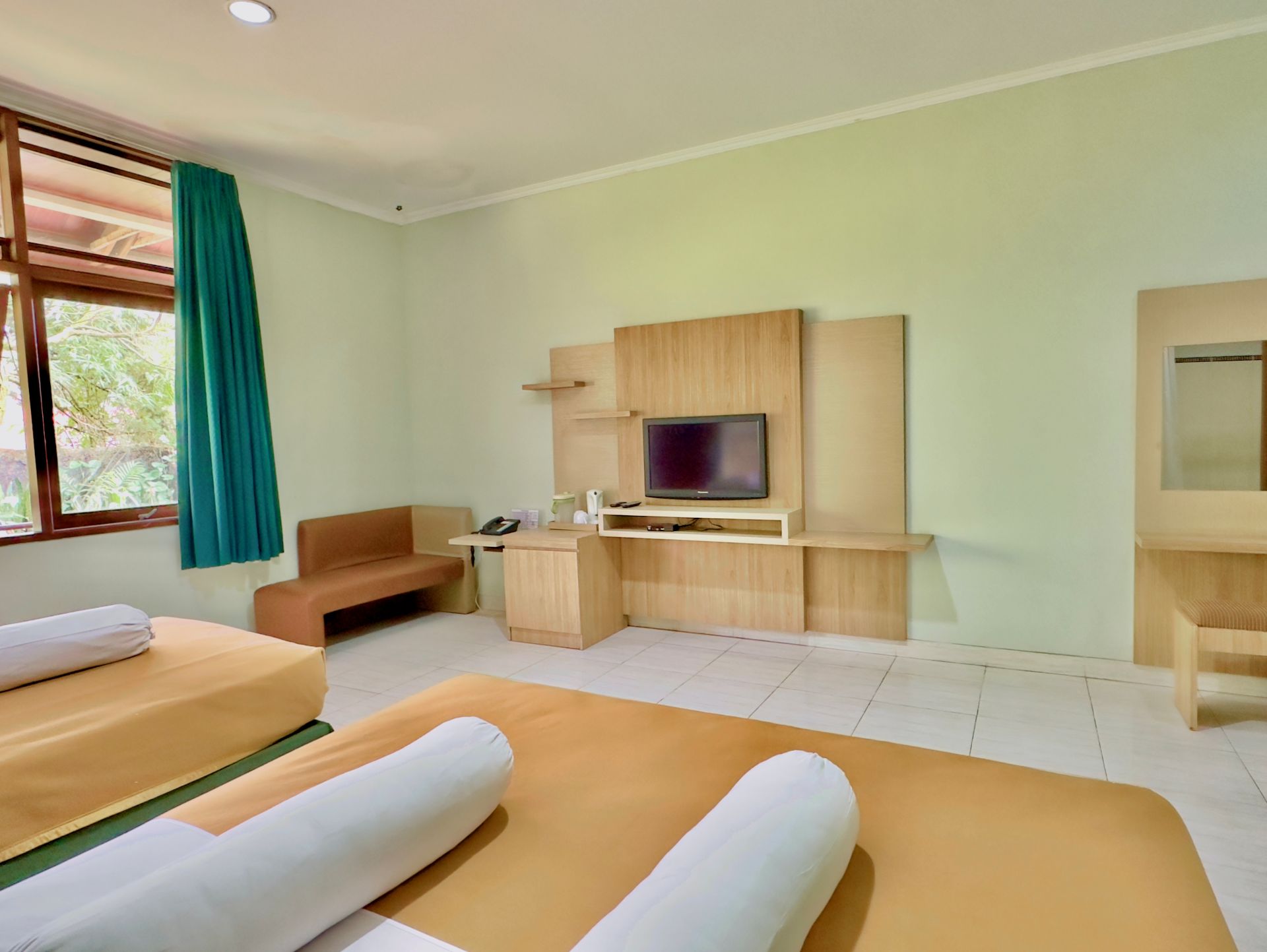 Amenities: Bathtub/shower dengan air panas, Handuk, LCD TV dengan siaran lokal dan in-house video, Lemari pendingin, Meja rias, Pesawat telepon, Sabun dan sampo