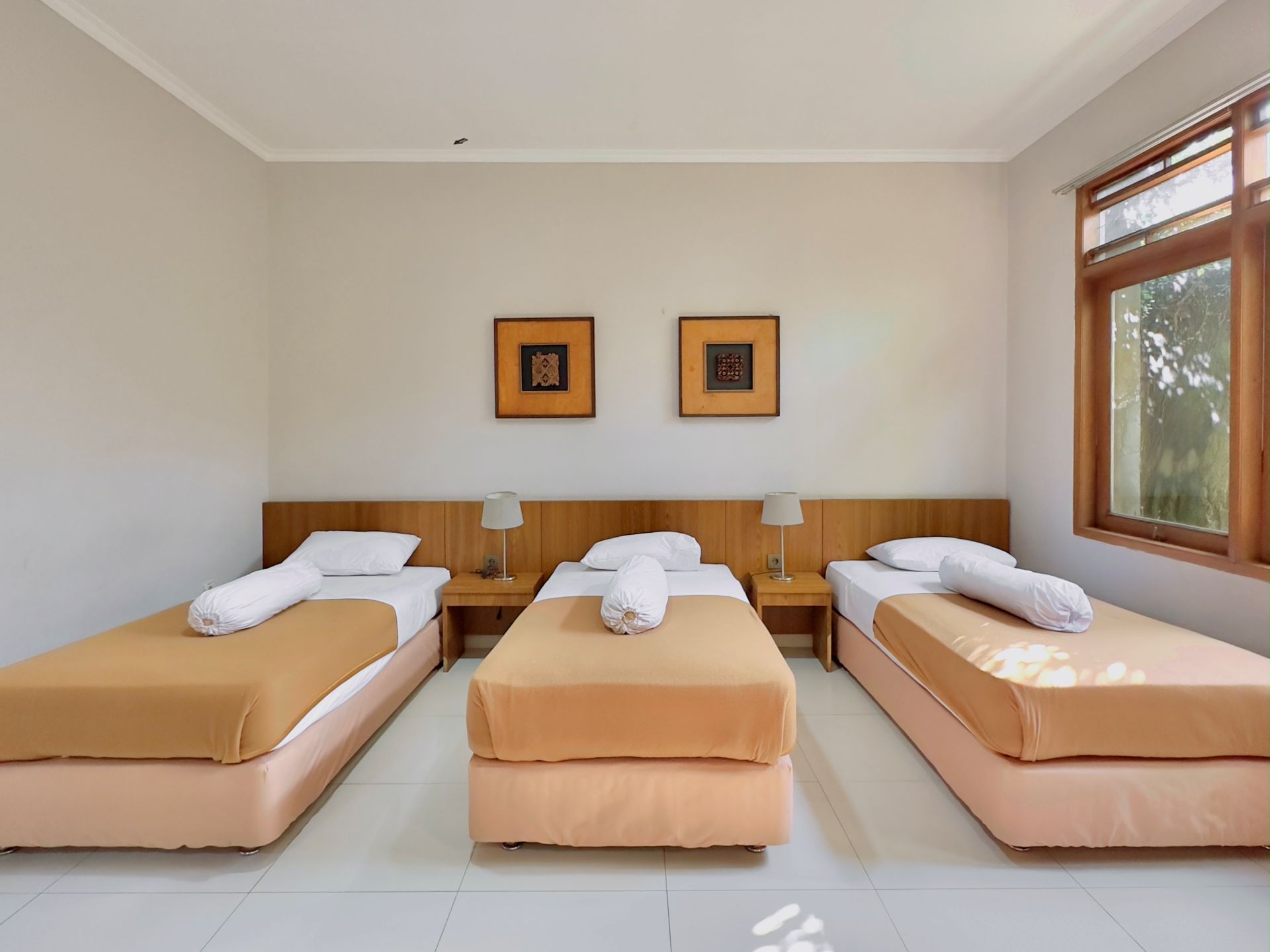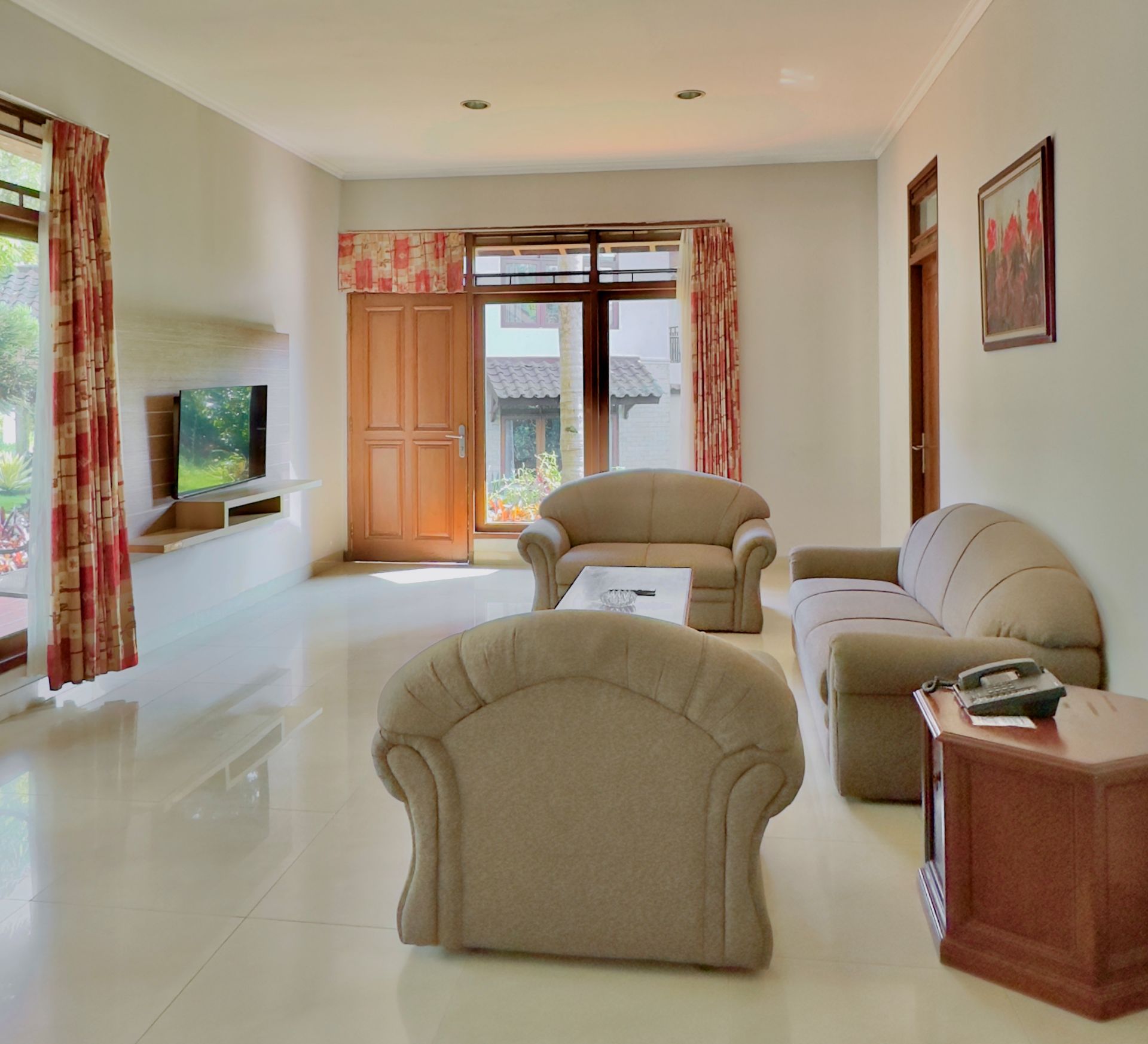 Amenities: Bathtub/shower dengan air panas, Dapur dengan kompor gas, rice cooker, dan peralatan memasak lainnya, Dispenser air minum, LCD TV dengan siaran lokal dan in-house video, Lemari pakaian, Lemari pendingin, Meja makan, Meja rias, Pesawat telepon